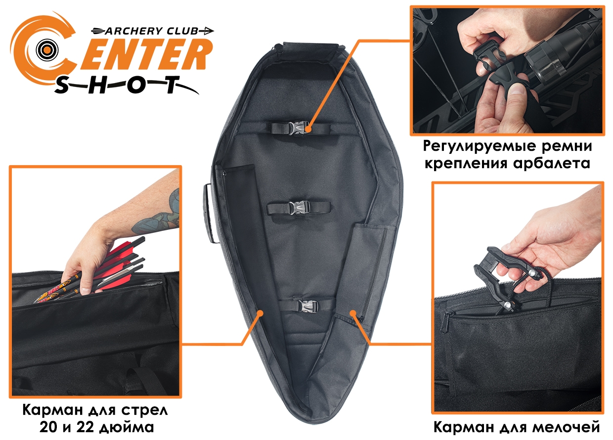 Чехол Centershot разработан для блочных арбалетов последнего поколения с узкими плечами и с технологией обратных блоков. В настоящее время на российском рынке представлены как минимум четыре модели, для которых подходит этот чехол: Ek Archery Vulcan 400 и Vulcan 415, а также Man Kung MK-XB70 Direwolf и MK-XB68 Blast.