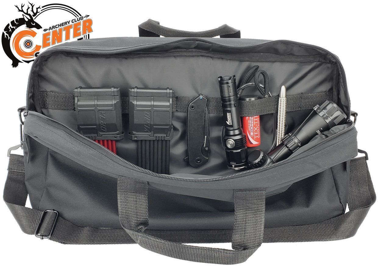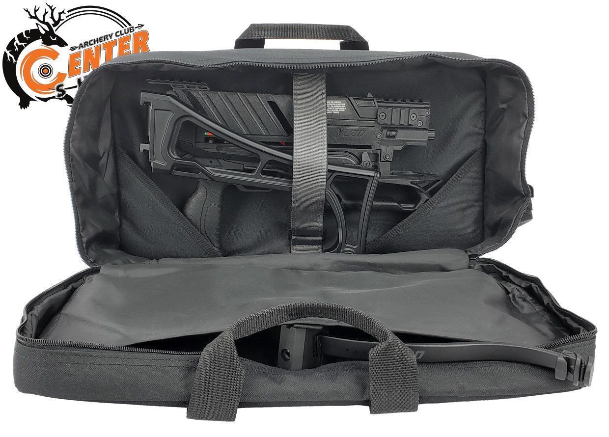 Чехол состоит из двух больших отделений для отдельного хранения арбалета и его плеч, а также для хранения стрел, обойм и прочих аксессуаров. Размер отделений позволяет помещать в чехол корпус арбалета вместе с коллиматорным прицелом и двумя (и даже более) комплектом плеч. Имеется дополнительный карман для мелочей и документов. Чехол очень вместителен. Внешние стенки чехла имеют дополнительное уплотнение, гарантирующее сохранность арбалета при перевозке. Предусмотрен ремень для ношения чехла на плече.