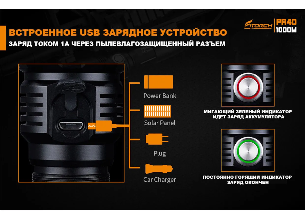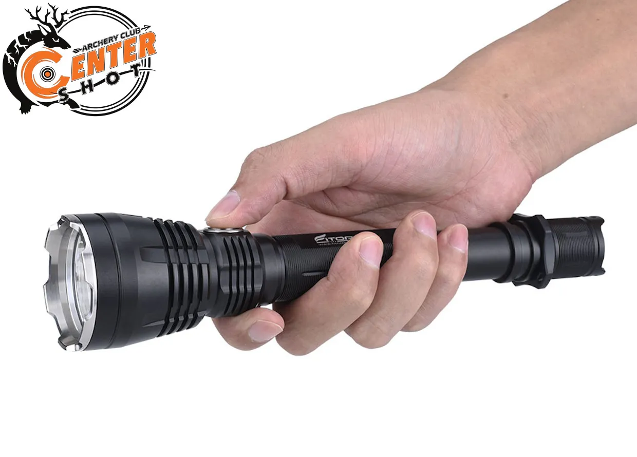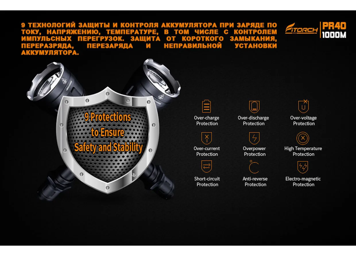 Fitorch PR40 – профессиональный поисковый фонарь, который подойдет, как для сотрудника спецслужб или охотника, так и для путешественника. Его главная особенность дальность освещения, которая достигает 1000 метров. Кроме того, при использовании экономного режима яркости, фонарь способен проработать до 430 часов, что ровняется 17 дням беспрерывной работы. Фонарь достаточно компактен и удобно располагается в руке, благодаря узкому корпусу. Может использоваться, как подствольный и крепиться к огнестрельному оружию на планку «Weaver» или «Picatinny». Обладает удобным управлением двумя кнопками: торцевой и боковой. В комплекте с фонарем идут сменные светофильтры четырех цветов, которые устанавливаются под съемный безель. А функция «Маяк» позволит найти фонарь в темноте по мерцанию специальной подсветки.