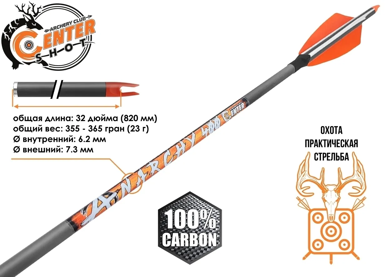 Стрелы Centershot ANARCHY полностью изготовлены из карбона и подходят как для новичков, так и для опытных стрелков. Применяются для любых традиционных или классических луков: спортивный рекурсивный (олимпийский), разборный (takedown), английский длинный (english longbow), короткий корейский (gakgung horsebow), могольский (mongol bow), флэтбоу (flatbow) и пр. При соответствии спайна и наличия подходящей полочки вы можете использовать эти стрелы и с блочными луками.