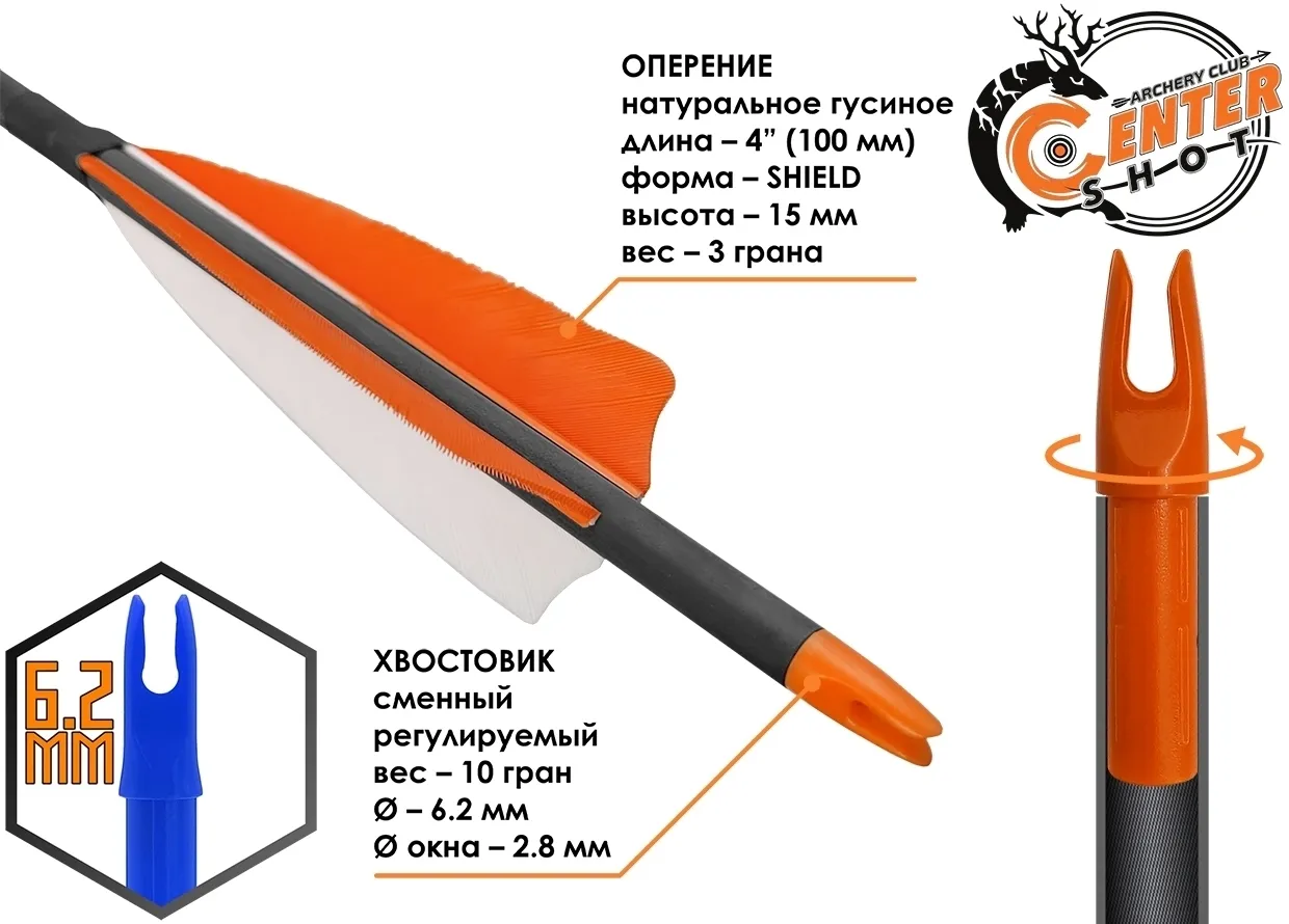 Толщина стрелы соответствует стандартному диаметру под наконечник 9/32 дюйма (7-7.5 мм). Внутренний диаметр карбоновой трубки равен 6.2 мм, что позволит легко подобрать нужные комплектующие: инсерты, хвостовики и оперение. При необходимости стрелы можно укоротить под размер вашей растяжки. Длина стрелы составляет 32 дюйма (820 мм), что позволяет стрелять свободным хватом и использовать стрелы людям высокого роста. Конструкция предусматривает термоклеевое крепление инсерта. Для его извлечения достаточно нагреть наконечник горелкой и извлечь его пассатижами вместе с инсертом. Хвостовик просто вставлен в трубку – вы можете поменять его положение или извлечь для замены.
