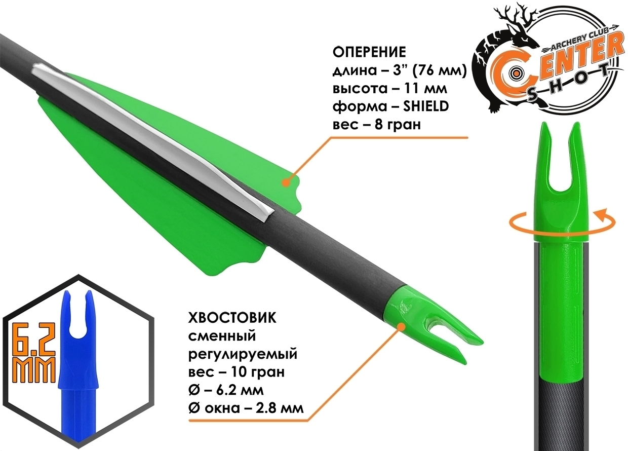 Толщина стрелы соответствует стандартному диаметру под наконечник 9/32 дюйма (7-7.5 мм). Внутренний диаметр карбоновой трубки равен 6.2 мм, что позволит легко подобрать нужные комплектующие: инсерты, хвостовики и оперение. При необходимости стрелы можно укоротить под размер вашей растяжки.