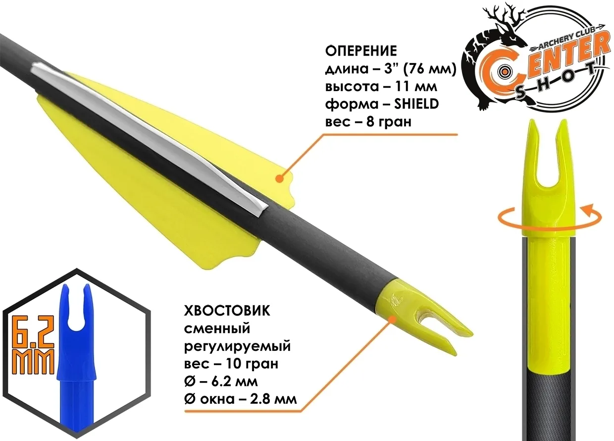 Толщина стрелы соответствует стандартному диаметру под наконечник 9/32 дюйма (7-7.5 мм). Внутренний диаметр карбоновой трубки равен 6.2 мм, что позволит легко подобрать нужные комплектующие: инсерты, хвостовики и оперение. При необходимости стрелы можно укоротить под размер вашей растяжки.