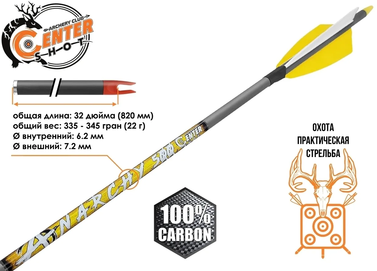 Стрелы Centershot ANARCHY полностью изготовлены из карбона и подходят как для новичков, так и для опытных стрелков. Применяются для любых традиционных или классических луков: спортивный рекурсивный (олимпийский), разборный (takedown), английский длинный (english longbow), короткий корейский (gakgung horsebow), могольский (mongol bow), флэтбоу (flatbow) и пр. При соответствии спайна и наличия подходящей полочки вы можете использовать эти стрелы и с блочными луками.