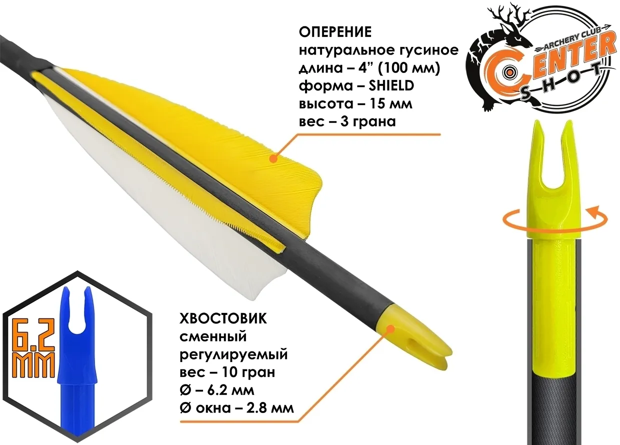 Толщина стрелы соответствует стандартному диаметру под наконечник 9/32 дюйма (7-7.5 мм). Внутренний диаметр карбоновой трубки равен 6.2 мм, что позволит легко подобрать нужные комплектующие: инсерты, хвостовики и оперение. При необходимости стрелы можно укоротить под размер вашей растяжки. Длина стрелы составляет 32 дюйма (820 мм), что позволяет стрелять свободным хватом и использовать стрелы людям высокого роста. Конструкция предусматривает термоклеевое крепление инсерта. Для его извлечения достаточно нагреть наконечник горелкой и извлечь его пассатижами вместе с инсертом. Хвостовик просто вставлен в трубку – вы можете поменять его положение или извлечь для замены.