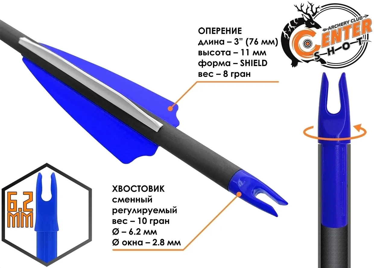 Толщина стрелы соответствует стандартному диаметру под наконечник 9/32 дюйма (7-7.5 мм). Внутренний диаметр карбоновой трубки равен 6.2 мм, что позволит легко подобрать нужные комплектующие: инсерты, хвостовики и оперение. При необходимости стрелы можно укоротить под размер вашей растяжки.