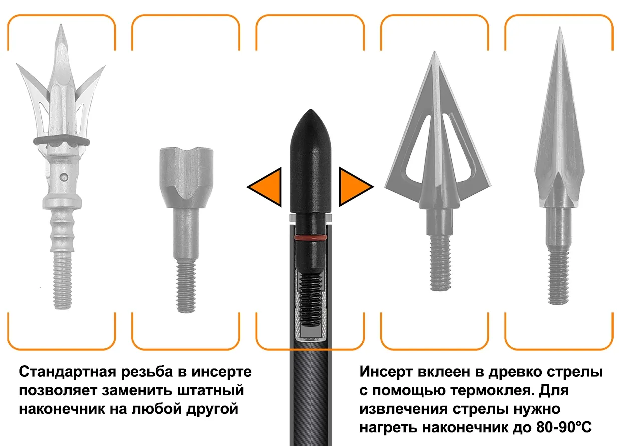 Наконечник: Вкручиваемый с инсертом. Диаметр: 9/32 дюйма. Вес: 100 гран. Форма: Bullet