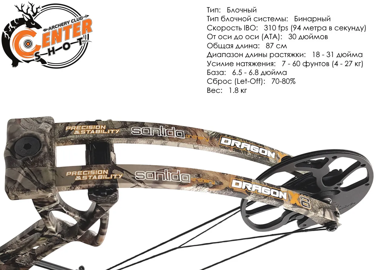 Охотничий блочный лук Sanlida Dragon X8 — это долгожданный компромисс, достигнутый благодаря современным техническим решениям и материалам. С одной стороны, это эффективный охотничий лук, демонстрирующий высокую скорость вылета стрелы, компактные габариты, актуальный дизайн и широкий диапазон регулировок, с другой – невысокая цена, доступная каждому.