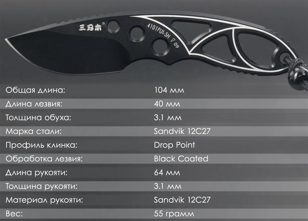 Комплектация: нож; ножны с фонариком; цепочка; темляк