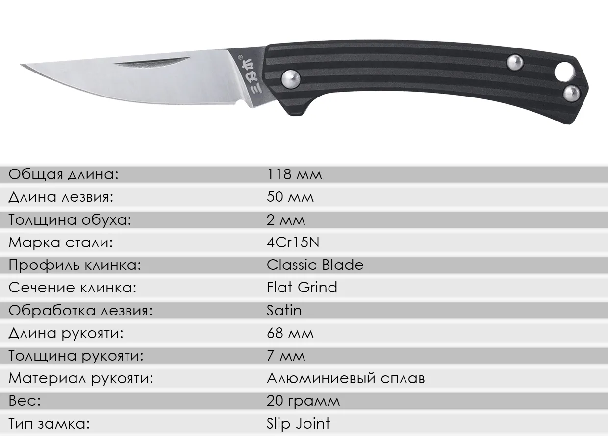 В открытом положении лезвие удерживается замком Slip Joint. Чтобы закрыть клинок, нужно просто приложить небольшое усилие - полной фиксацией нож не обладает.