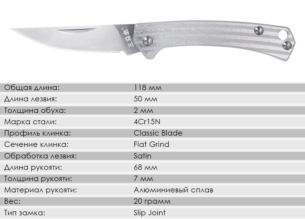 Клинок выполнен из стали 4Cr15N. Ножи из этой стали выделяются по стойкости к коррозии и пружинности. Отличная устойчивость к коррозии. Можно на неделю забыть нож в соленой воде, ему практически ничего не будет. Из-за своей коррозионной стойкости и устойчивости к слабоагрессивным средам, ножи с клинками из 4Cr15N любят водолазы, дайверы и рыбаки.