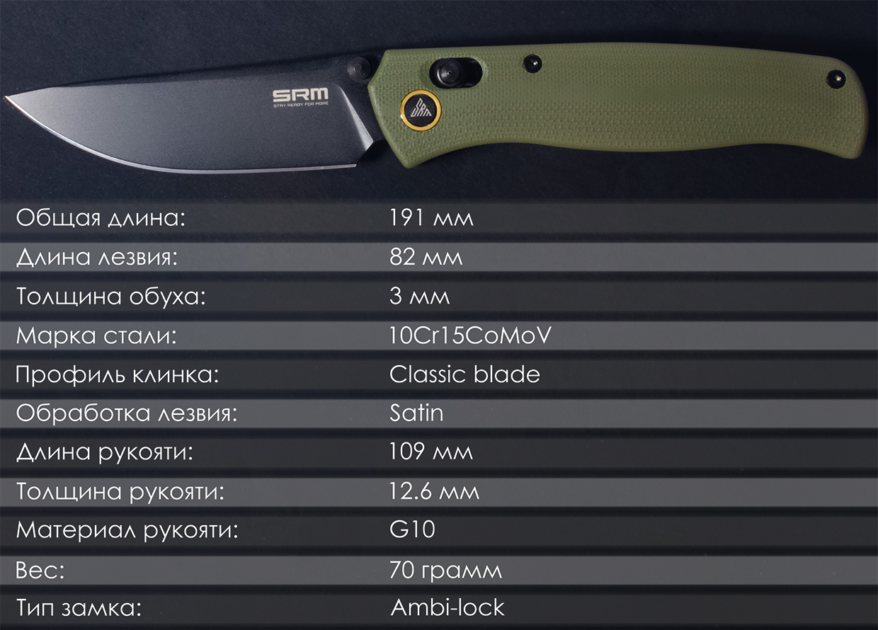 SRM 255L-GP2 – усовершенствованная версия ножа 255L-GP, получившим свое признание благодаря исключительной механике раскрытия лезвия, а также классическому дизайну клинка и рукояти. От предыдущей версии нож отличается наличием керамических подшипников в осевом узле. Клинок ножа имеет профиль Drop-Point. Длинная режущая кромка обеспечивает хороший рез, а высокие колющие качества достигаются благодаря острию, которое находится практически на одной линии с центром рукоятки. Это наиболее распространенная и утилитарная форма клинка. Клинок ножа выполнен из стали марки 10Cr15CoMoV – высококачественной стали, являющейся аналогом знаменитой японской VG-10. Лезвие из стали 10Cr15CoMoV долго держит заточку, отличается высокой твердостью и износоустойчивостью. Несмотря на то, что 10Cr15CoMoV относится к высокоуглеродистым маркам стали, она не ржавеет и не окисляется, что делают ее одной из лучших сталей в своем сегменте. Рукоять ножа выполнена из G10 – одного из самых популярных материалов для изготовления рукояток ножей. G10 – это композит из стеклоткани и эпоксидных смол, отличающийся потрясающей прочностью, устойчивостью к износу и стойкостью к перепадам температурам. Кроме того, G10 не скользит в руке, не впитывает влагу и обладает низкой электрической проводимостью. За открывание и фиксацию лезвия отвечает замок Ambi Lock. Работа замка основывается на запирании лезвия подпружиненным сквозным ригелем, установленным перпендикулярно клинку в сквозную прорезь на рукояти. Главное преимущество замка Ambi Lock – это открытие лезвия любой рукой с минимальными усилиями. Лезвие буквально выскакивает из рукоятки, при этом надежно фиксируясь в открытом виде. Нож открывается с помощью шпенька. Это наиболее популярный метод открытия современных ножей. Просто, компактно и удобно. Характеристики: Общая длина: 191 мм Длина лезвия: 82 мм Толщина обуха: 3 мм Марка стали: 10Cr15CoMoV Профиль клинка: Drop Point Обработка лезвия: Black Coated Длина рукояти: 109 мм Толщина рукояти: 12.6 мм Материал рукояти: G10 Цвет рукояти: хаки Вес: 70 грамм Тип замка: Аmbi-lock Метод открытия: шпенек Назначение: EDC ежедневное ношение; туризм; охота Бренд: SanRenMu Hardware Technology Страна производства: Китай