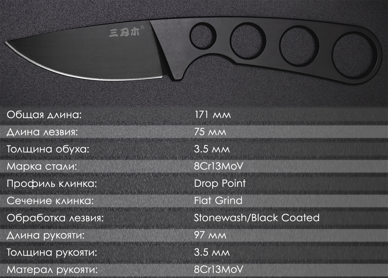 Профиль клинка – Drop Point. Лезвие компактное, широкое с толстым обухом. Марка стали 8Cr13MoV. Рукоять является продолжением клинка и имеет несколько отверстий, крайнее из которых позволяет продевать в него палец.