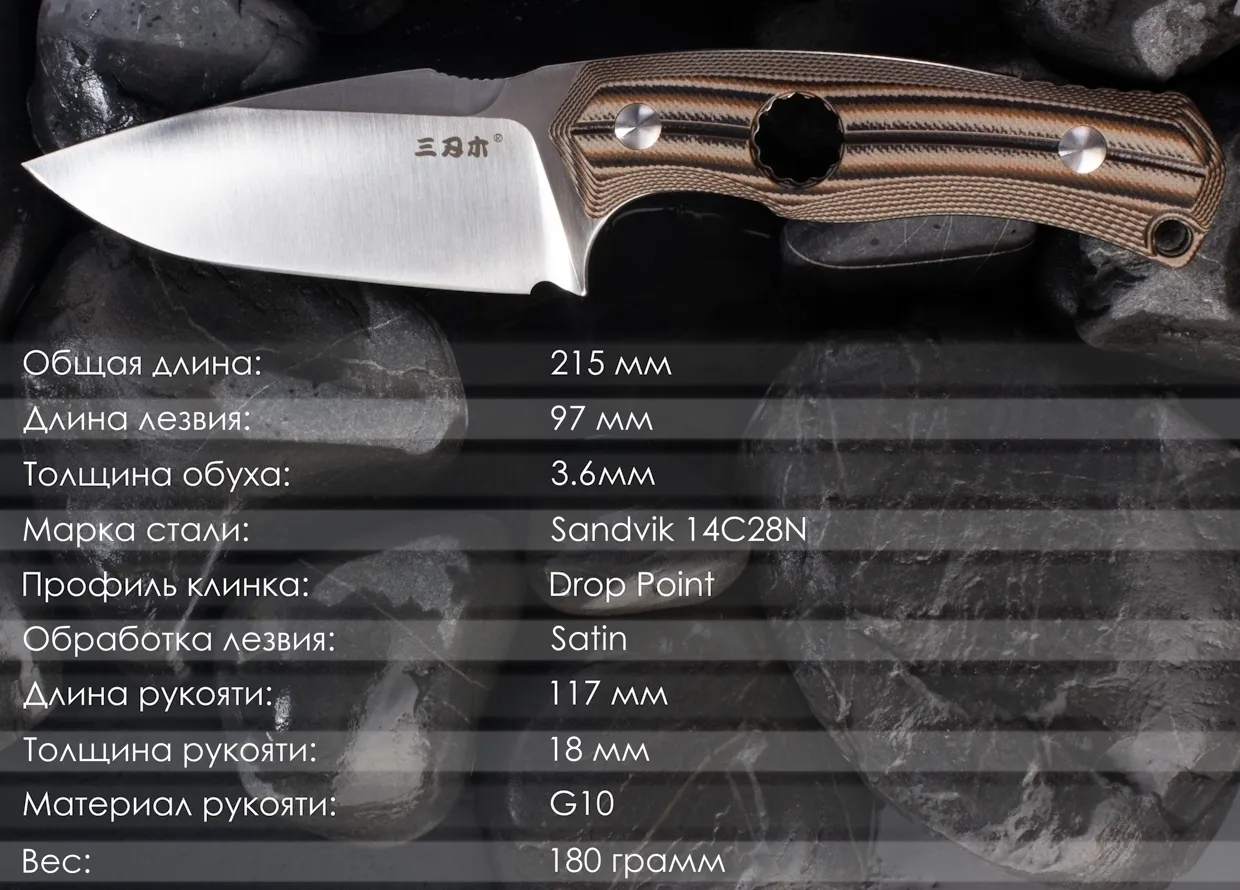Нож с фиксированным лезвием Sanrenmu S725P – мощный монолитный нож для тактического и туристического использования. Сталь клинка - Sandvik 14C28N с накладками из G10. Комплектуется ножнами из кайдекса.
