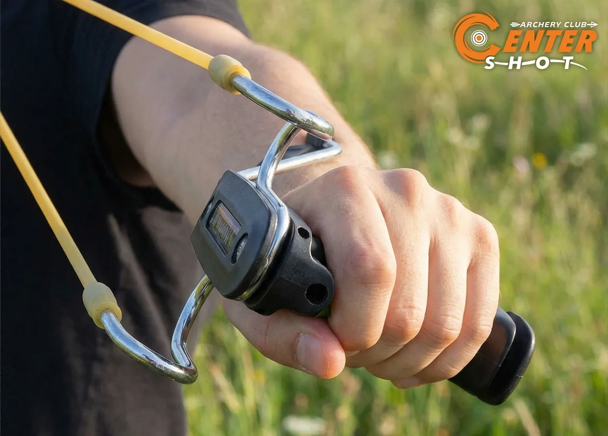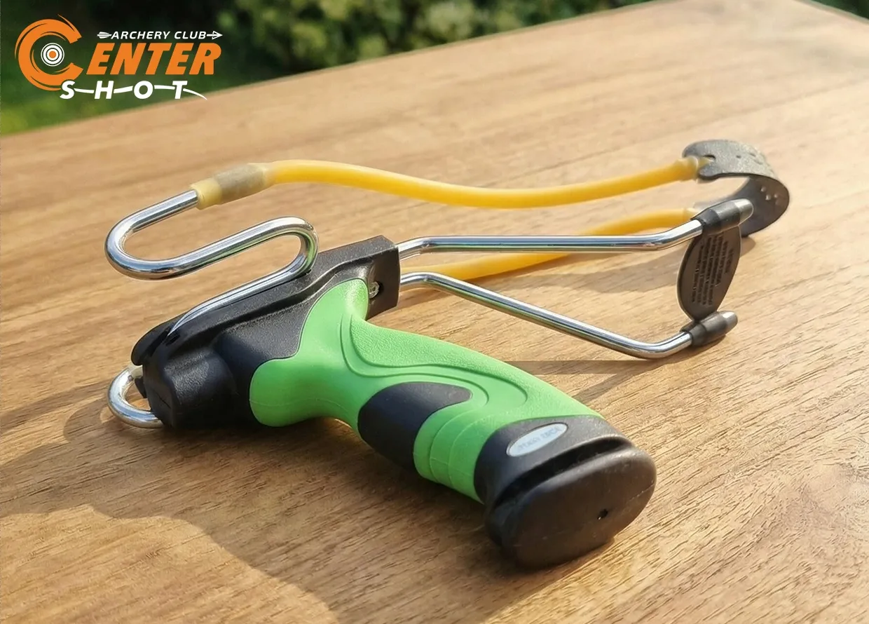 Рогатка оснащена металлическим упором. Упор позволяет снять нагрузку с лучезапястного сустава, сместив ее на предплечье. Это упрощает прицеливание, увеличивая точность и дальность стрельбы.