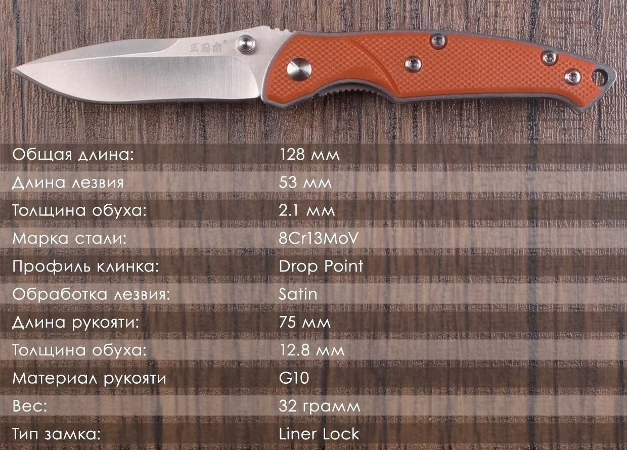 Клинок ножа выполнен из стали 8Cr13MOV. Это недорогая высокоуглеродистая нержавеющая сталь с хорошим сочетанием износостойкости и противокоррозионной устойчивости. Обладаем хорошим резом и легко затачивается, поэтому часто применяется для городских и туристических ножей.
