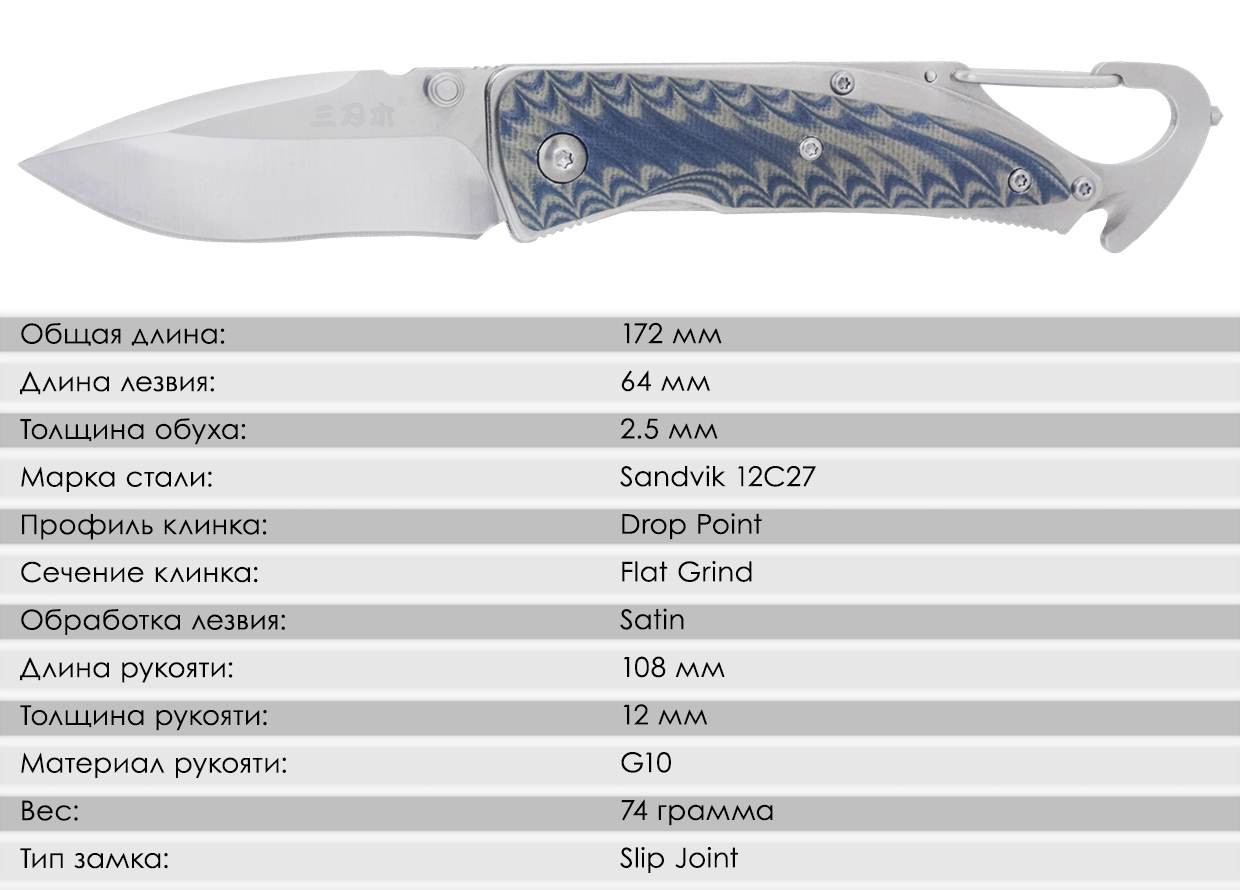 Карманный нож оснащен стропорезом и стеклобоем, что делает его незаменимым помощником как в автомобиле, так и в повседневной жизни. Интегрированный карабин позволяет удобно носить нож на поясе, рюкзаке или снаряжении, что особенно важно для ножа карманного формата.