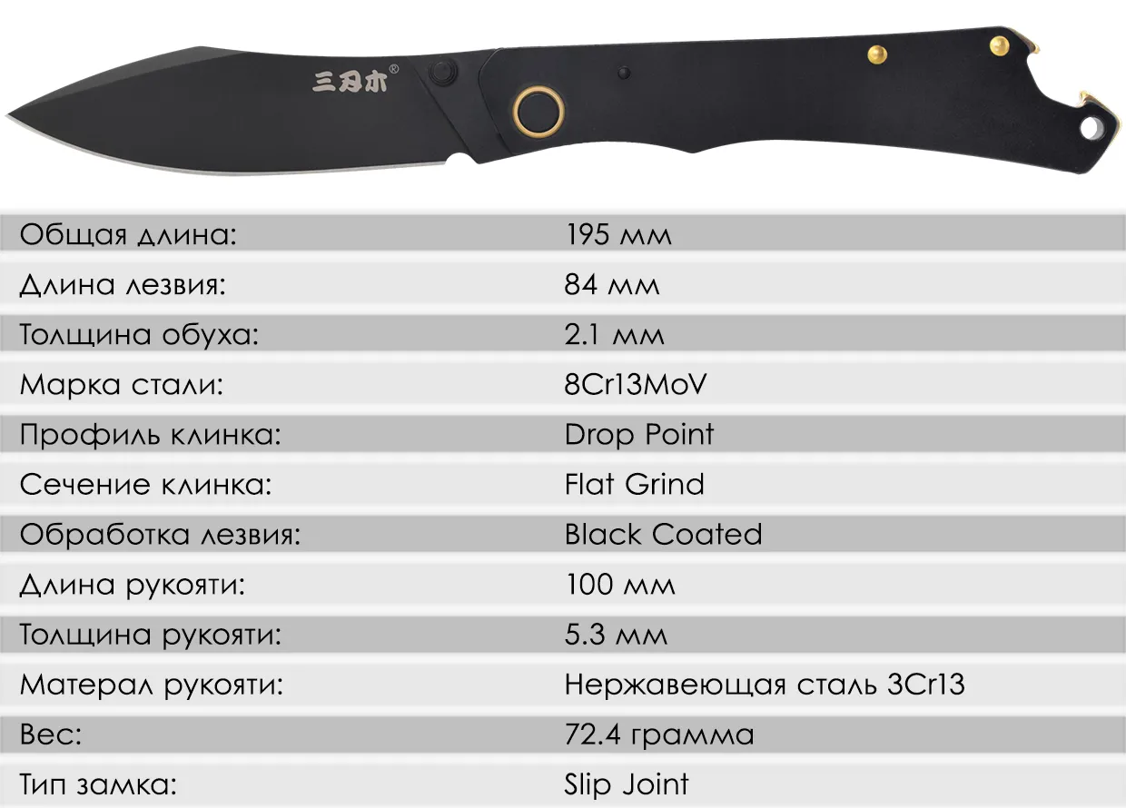 Складной нож Sanrenmu 9306-SB отлично подходит для ежедневного ношения (EDC). Полностью выполнен из нержавеющей стали и имеет стильный дизайн. Обладает сверхтонким профилем – толщина рукоятки составляет всего 5.3 мм, что делает его очень удобным в ношении в кармане джинс или рюкзака. Sanrenmu 9306 один из самых популярных ножей бренда.