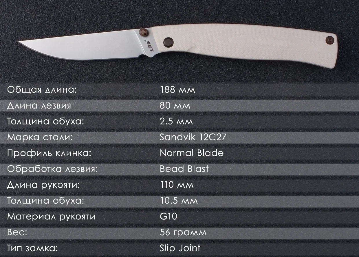SanRenMu 311L – элегантный джентельменский нож для повседневного ношения. Классическая форма клинка и рукояти делают этот нож одинаково уместным и в разрезании бифштекса в городском ресторане и нарезки сосисок на пикнике. Клинок ножа выполнен из шведской стали Sandvic 12C27. Это недорогая нержавеющая марка стали считается одной из лучших в своем классе благодаря исходному сырью – скандинавской руде, насыщенной ванадием, цирконием и другими ценными примесями. Sandvic 12C27 обладает высокой противокоррозионной стойкостью, легко затачивается и устойчива к сколам. Клинок ножа имеет классический скандинавский профиль Normal Blade. Режущая кромка поднимается к острию, которое располагается на одной линии с прямым длинным обухом – это многофункциональный профиль, позволяющий использовать нож в самых разных сферах применения. Рукоять ножа выполнена из G10 – одного из самых популярных материалов для изготовления рукояток ножей. G10 – это композит из стеклоткани и эпоксидных смол, отличающийся потрясающей прочностью, устойчивостью к износу и стойкостью к перепадам температурам. Кроме того, G10 не скользит в руке, не впитывает влагу и обладает низкой электрической проводимостью. В открытом положении лезвие удерживается замком Slip Joint. Чтобы закрыть клинок, нужно просто приложить небольшое усилие - полной фиксацией нож не обладает. Нож открывается с помощью шпенька. Это наиболее популярный метод открытия современных ножей. Просто, компактно и удобно. Характеристики: Общая длина: 190 мм Длина лезвия: 80 мм Толщина обуха: 2.5 мм Марка стали: Sandvik 12C27 Твердость по Роквеллу: 56-58 HRC Профиль клинка: Normal Blade Обработка лезвия: Bead blast Осевой узел: шайба Длина рукояти: 110 мм Толщина рукояти: 10.5 мм Материал рукояти: G10 Вес: 56 грамм Тип замка: Slip Joint Метод открытия: шпенек Назначение: EDC ежедневное ношение; джентельменский нож