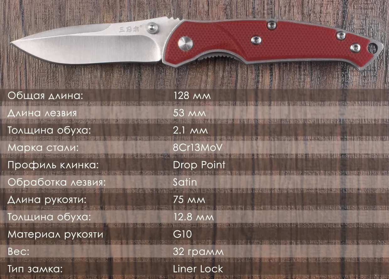 Складной нож Sanrenmu 6029LUC отлично подходит для ежедневного ношения (EDC). Клинок выполнен из стали марки 8Cr13Mov, а накладки рукоятки из G10. Несмотря на крохотные размеры, ножик снабжен замком Liner Lock и может выполнять довольно грубую работу. Клинок ножа выполнен из стали 8Cr13MOV. Это недорогая высокоуглеродистая нержавеющая сталь с хорошим сочетанием износостойкости и противокоррозионной устойчивости. Обладаем хорошим резом и легко затачивается, поэтому часто применяется для городских и туристических ножей. Клинок ножа имеет профиль Drop-Point. Длинная режущая кромка обеспечивает хороший рез, а высокие колющие качества достигаются благодаря острию, которое находится практически на одной линии с центром рукоятки. Это наиболее распространенная и утилитарная форма клинка. Рукоять ножа выполнена из G10 – одного из самых популярных материалов для изготовления рукояток ножей. G10 – это композит из стеклоткани и эпоксидных смол, отличающийся потрясающей прочностью, устойчивостью к износу и стойкостью к перепадам температур. Кроме того, G10 не скользит в руке, не впитывает влагу и обладает низкой электрической проводимостью. Фиксацию лезвия выполняет Liner Lock. Это сверхпопулярная, надежная и простая конструкция. Лезвие при открывании запирается специальной пружиной – лайнером, располагающимся во внутренней части рукоятки. Для разблокировки лезвия нужно просто отодвинуть лайнер большим пальцем руки. Нож открывается с помощью шпенька. Это наиболее популярный метод открытия современных ножей. Просто, компактно и удобно. Характеристики: Общая длина: 128 мм Длина лезвия: 53 мм Толщина обуха: 2.1 мм Марка стали: 8Cr13Mov Твердость по Роквеллу: 57-58 HRC Профиль клинка: Drop-Point Обработка лезвия: Satin Осевой узел: шайба Длина рукояти: 75 мм Толщина рукояти: 12.5 мм Материал рукояти: G10 Вес: 32 грамм Тип замка: Liner Lock Метод открытия: шпенек Назначение: EDC ежедневное ношение; джентельменский нож