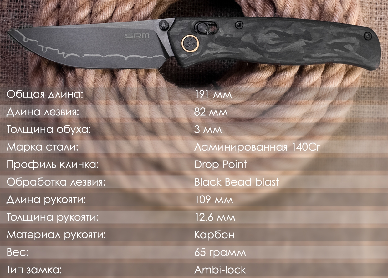 Рукоять ножа выполнена из карбона. Карбон – это дорогой и престижный материл, главным свойством которого является сочетание высокой прочности и удивительной легкости. Углепластиковое волокно, являющееся основой материала, создает на поверхности рукояти характерный узнаваемый рисунок.