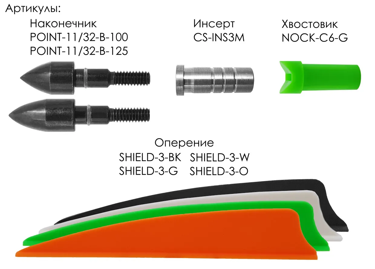 Оперение: Длина: 3 дюйма (76 мм); Форма: Shield. Материал: искусственное.