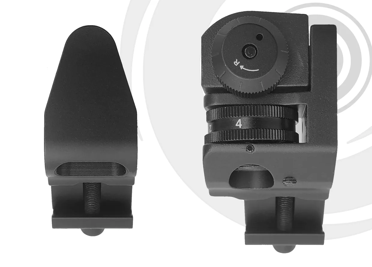 Целик имеет горизонтальную и вертикальную пошаговую (клики) регулировку. Поправки вводятся с помощью барабанчика с правой и нижней стороны. Также имеется возможность использовать одно из двух размеров прицельных отверстий: 1.7 мм и 5 мм.